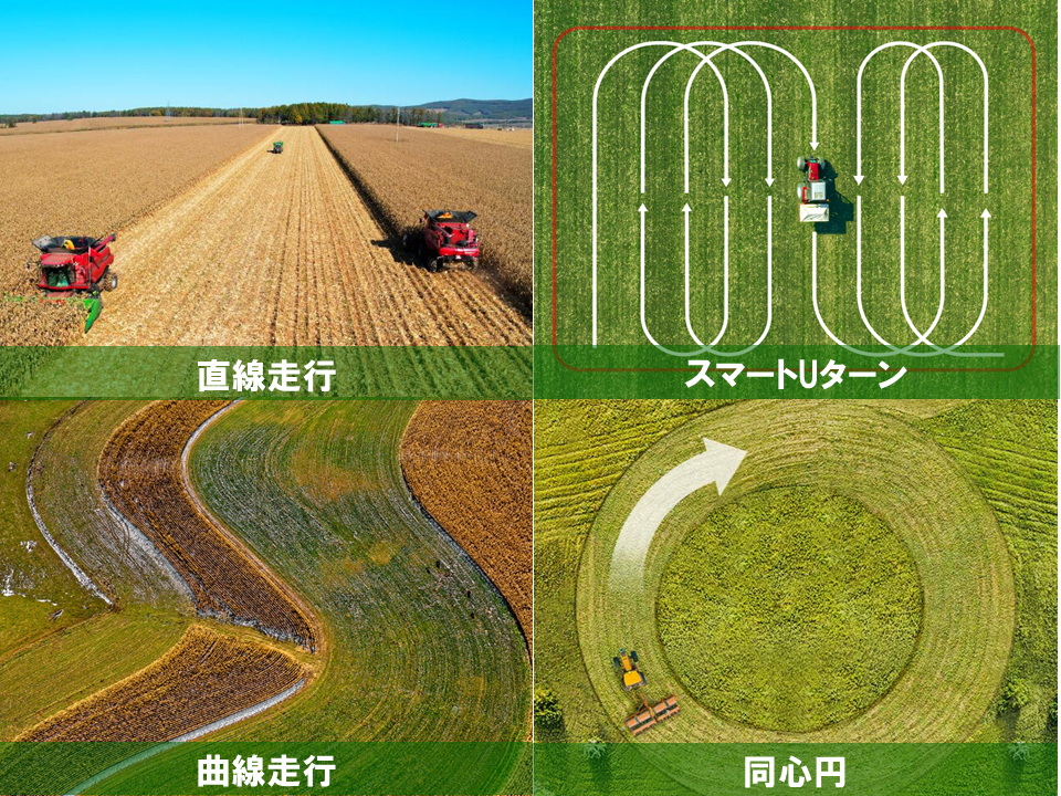 スマドラで最も使用頻度が多いAB直線から,指定した作業範囲をAIで最適ルートを作成し自動で全エリアを走行するスマートUターン等,圃場の特徴と作業種類に応じた豊富なモードを搭載しています。
